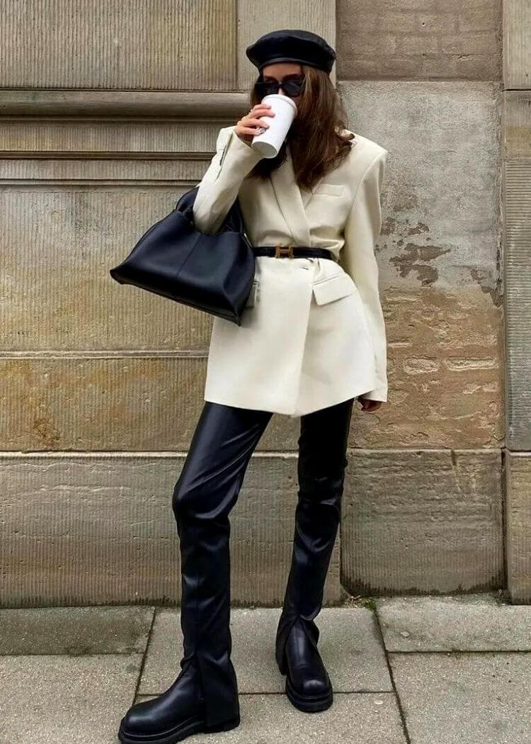 Style your leather pants with a long coat and boots. For accessories grab your favorite bag, sunglasses, and a beanie. You may want to sinch your waist using a belt.