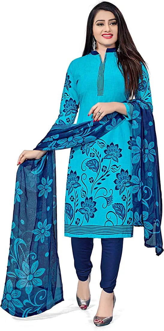 Let’s see one more design with the same color combination. In this costume, the kameez i.e. top is designed in such a way that the natural designs of flowers are used to create a great impact on the traditional one. The neck is completely closed. Here, the upper part of the kameez is not having any designs except the neck design. Other space is kept completely blank. At the below side of the kameez, there is the design of natural flowers & petals. The designs are simple & look printed. The design color used is a dark blue color on a sky-blue background. Here, the sleeves are full size, but with a dark blue color design on them.