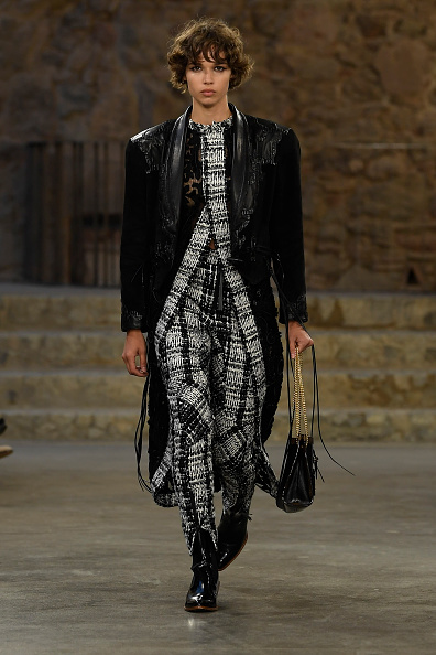 Louis Vuitton Resort 2025 black and silver embellished coat designed by Nicolas Ghesquiere. Picture source: Giannoni/WWD via Getty Images.