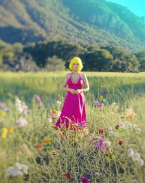 This light blue dress along with blue tights, a black wig, and a matching hair accessory was by far my favorite look from the music video.