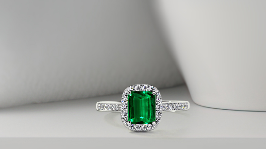 For those seeking a more dazzling display, the diamond surround style is a perfect choice. In this design, a halo of smaller diamonds encircles the emerald, creating a mesmerizing frame that amplifies its beauty. The brilliance of the diamonds enhances the green hue of the emerald, resulting in a ring that exudes opulence and glamor.