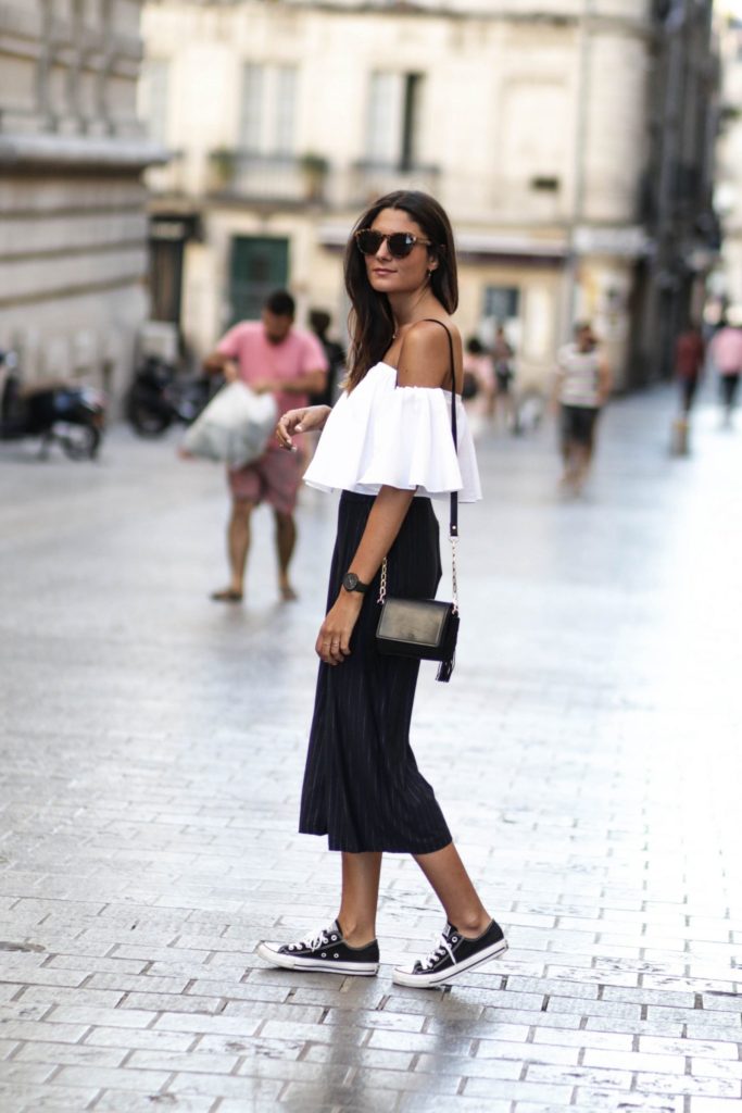 4. Classic black converse is the ideal match to an outfit consisting of culottes and an off-the-shoulder top, such as this one. You can make this outfit a must-try.
