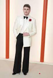 Okay, so Mescal sported a sharp double-breasted white blazer in a savor of satin fabric. He also wore a red rose and the Faune et Flore de Cartier High Jewelry brooch on his left shoulder, as well as a butterfly bow tie.