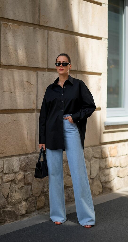 Oversized button-ups do not all have the same effect. Its secret lies in finding one that does not feel too big but deliberately so. Search out shirts that have lower shoulders, longer hems, and loose sleeves that do not lose their clean fit.