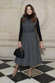 The fashion model donned a simple yet elegant ensemble for Paris fashion week. Pairing a long-sleeved, black turtle neck shirt with a grey sleeveless dress tied at the waist and net socks inside her black and grey embellished shoes. She accessorized her outfit with a black bag and grey glasses.