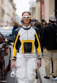 The Influencer/Model stepped out for the Schiaparelli show in a glamorous street-style outfit on January 23rd, 2023. The model wore a straw hat with a unique bird motif and a white blouse with the ultimate wide-shoulder silhouette, adorned with feathers. She paired it with oversized gold earrings and black high-waisted stirrup leggings. Her outfit showed that street style can be versatile, ranging from a classy look to a glamorous ensemble.