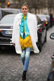 Olivia, a fashion influencer and American socialite stun Paris fashion week in two amazing outfits. First rocking her layers of comfort outfit at George’s Hobeika show, she was spotted wearing a bright blue jacket with a yellow feather border, a white fur coat, distressed skinny jeans, and rhinestone ankle boots. I adore her ability to pair these layers upon layers of comfort clothes and still make them look very chic and simple. This is me, thinking I’m already falling in love with sparkly boots.
