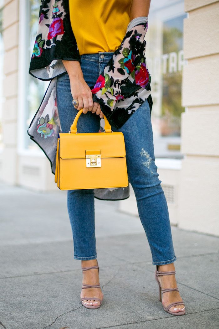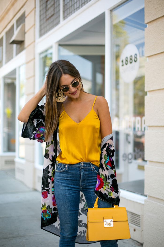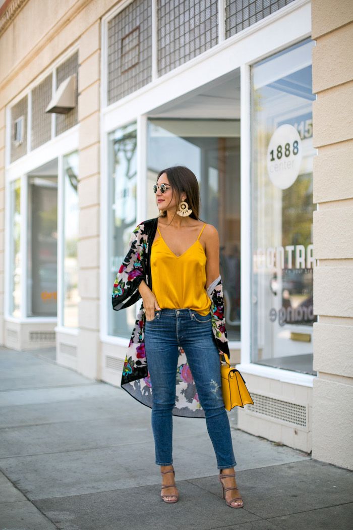 As we all know, the kimono is the statement piece in this outfit, and it already has a lovely print, so pairing it with this mustard color cami top, the mustard handbag that complements the kimono and its printed design perfectly, and then the blue jeans and shoes, etc. that all came together well for this stylish outfit.