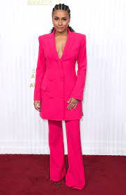 Okay, if you are a lover of anything suit, blazer, and pant trousers, just take a look at Ariana’s colorful outfit at the event. The American actress stunned on the carpet wearing a pink double-breasted blazer with sharp, squared-off shoulders and flared pants that hid her shoes.