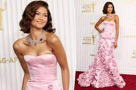 Zendaya rocked a spring floral vibe on the red carpet, wearing a baby pink custom Valentino ballgown. Serving us with cool spring vibes, her dress was covered with rosettes of all sizes. Each rose starts from the end of the train all the way up to the middle of the corset-style bodice. Zendaya’s dress was glammed up with a necklace featuring multicolored stones, a pair of stud earrings, and a single matching silver cuff.