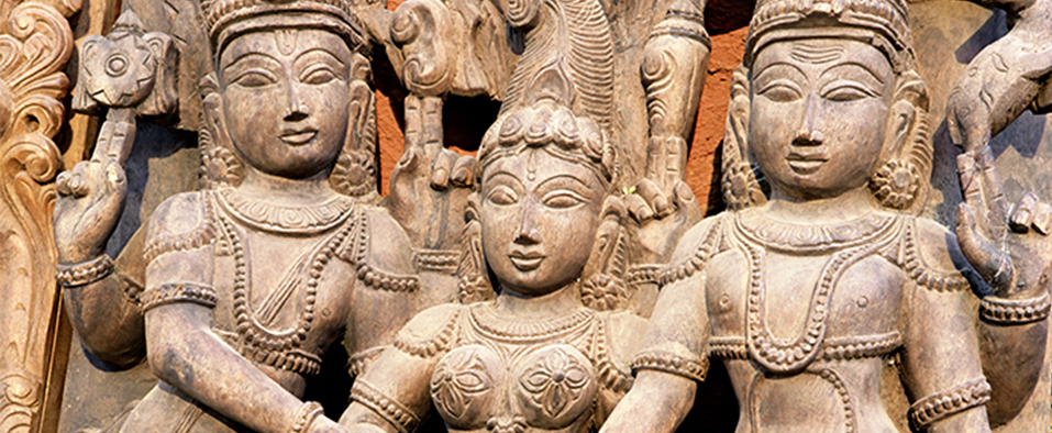 Sculptor’s imagination of Ram with wife Sita and brother Lakshman: clothing, headgear, and ornamentsÂ