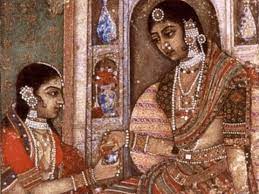 Image of woman and her handmaiden, presumably royalty, showing the evolved sari with a blouse or ‘choli’ along with jewelryÂ