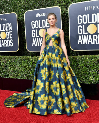 Taylor was also spotted on the 2020 red carpet, where her style was all over the place. She wore an Etro blue silk jacquard floral print dress with an open back, a keyhole cutout, and a ball skirt with a train flowing behind, along with Christian Louboutin navy satin sandals.