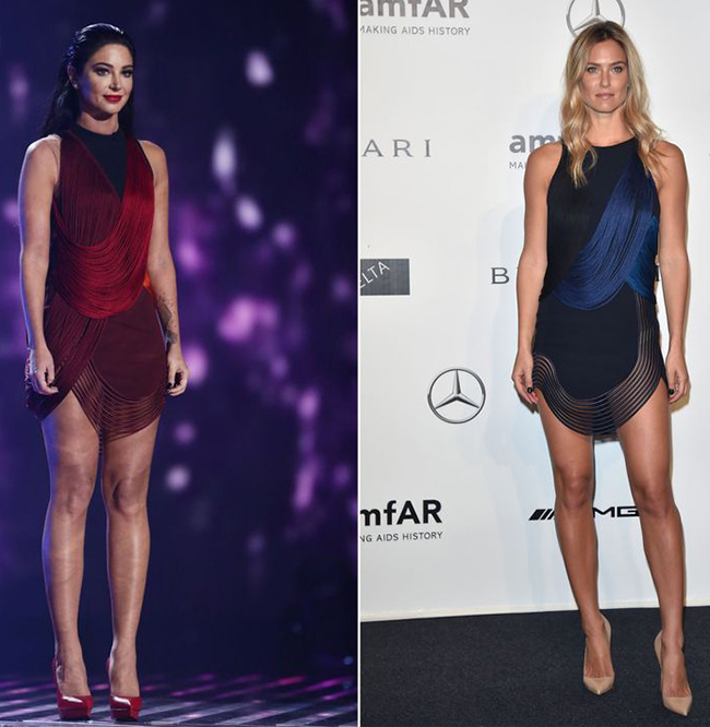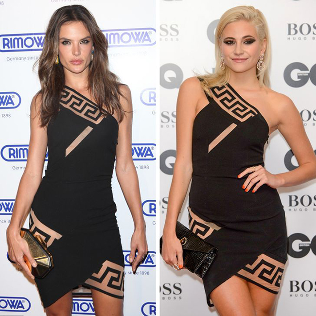 Victoria’s Secret Angel Alessandra Ambrosio and British artist Pixie Lott both wore identical cutting designs from the Italian fashion house’s spring 2015 collection, but they are almost a year apart! In October 2014, Alessandra debuted the one-shoulder design with Greek details at an event in New York City. The sultry ensemble was completed by modest Versace heels, gold earrings, and a handbag. Pixie wore the exact dress with subtly different embellishments nearly a year later, in September 2015, at the GQ Men of the Year Awards in London. To complete the look, the singer chose stiletto shoes and a glittery handbag.