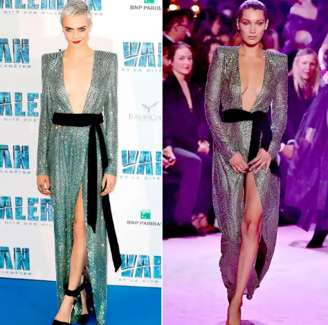 Delevingne, 24, and Hadid, 20, both wore expensive maxi gowns with extremely low and sensual necklines. It includes long sleeves and Swarovski crystal beading. It has a waist belt with a black velvet tie. A thigh-high slit is another really attractive feature.