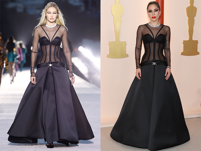 Lady Gaga appeared at this year’s Oscars in a breathtaking see-through gown, which was also donned by Gigi Hadid. The model debuted the eye-catching black gown at Versace’s early fall show just three days prior, with each star flaunting various beauty styles and jewelry.